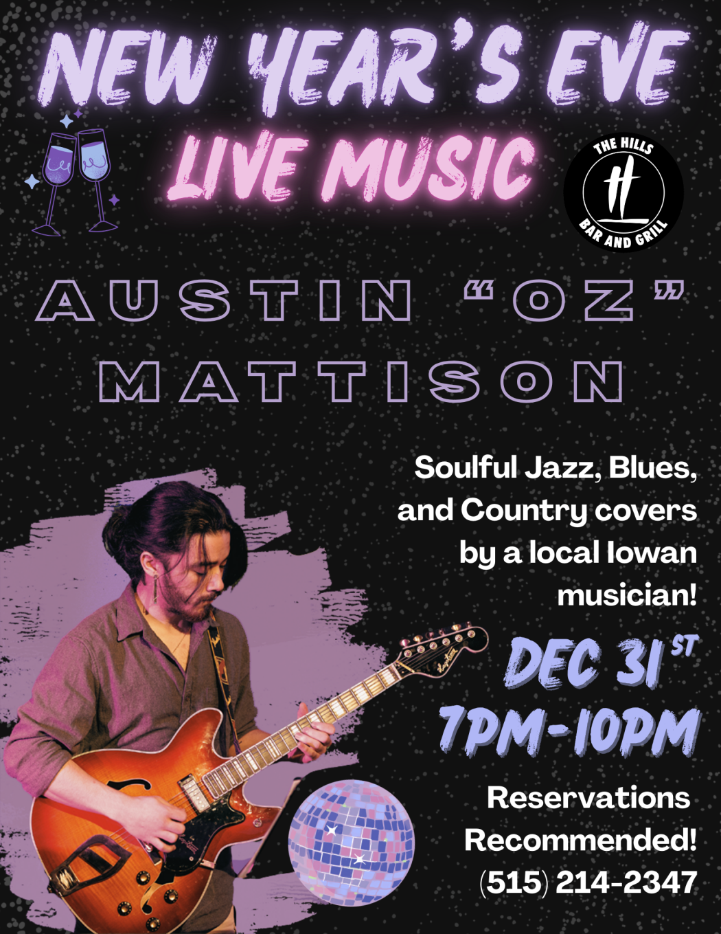 Local Iowan musician, Austin “Oz” Mattison, will be playing soulful jazz, blues, & country tunes for the evening.